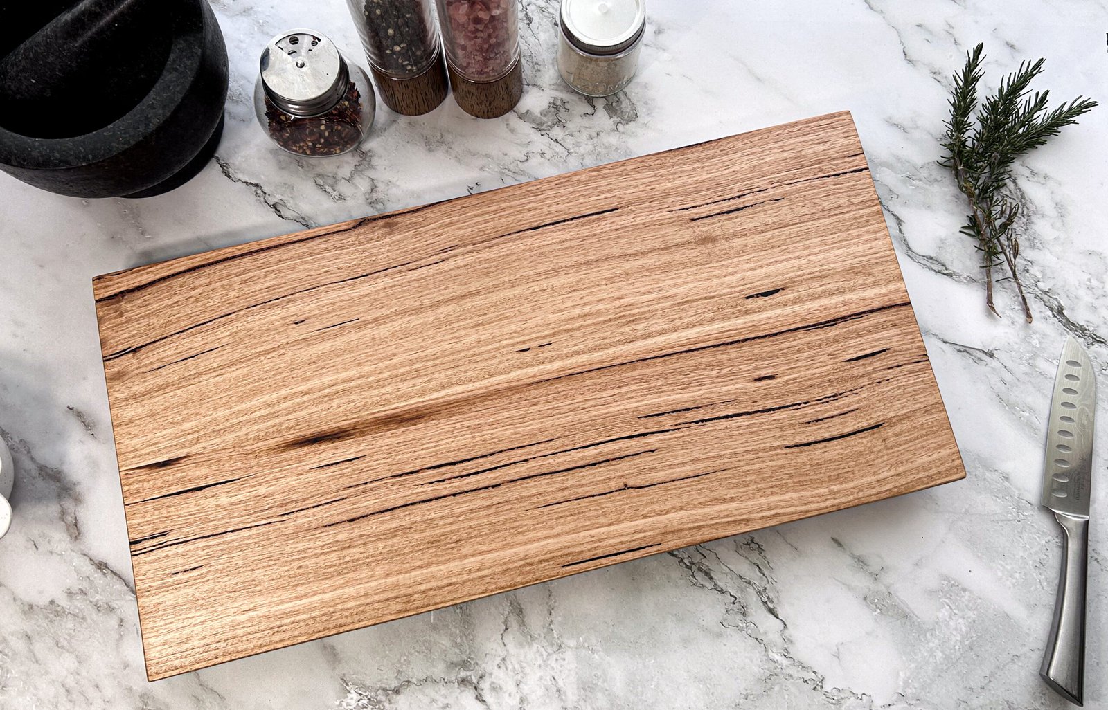 Sustainably crafted Tasmanian Oak using food-safe materials, showcasing the natural character of Australian hardwood. Subtle timber veins are hand-cleaned and filled with certified food-safe epoxy for a durable, functional cutting or serving board.