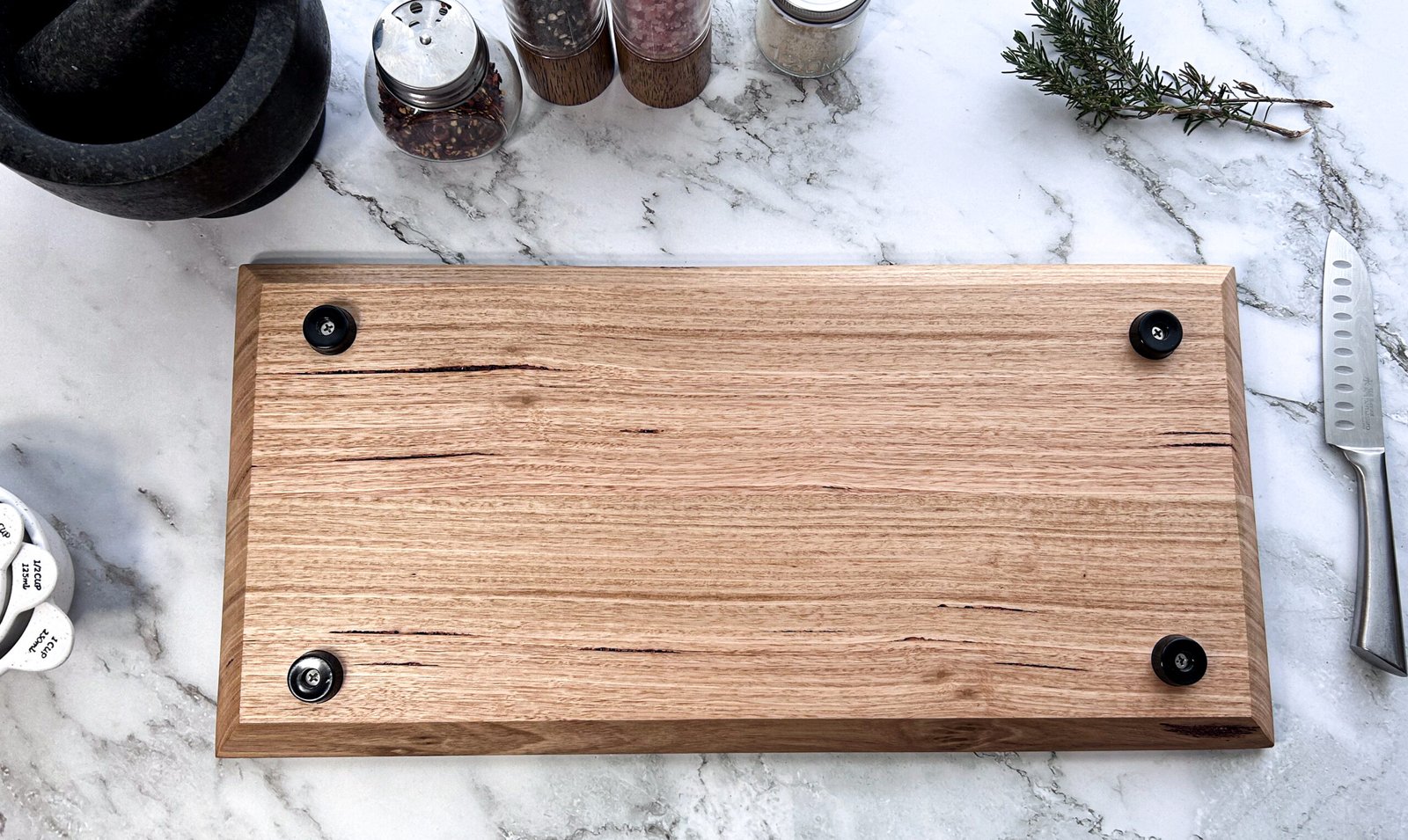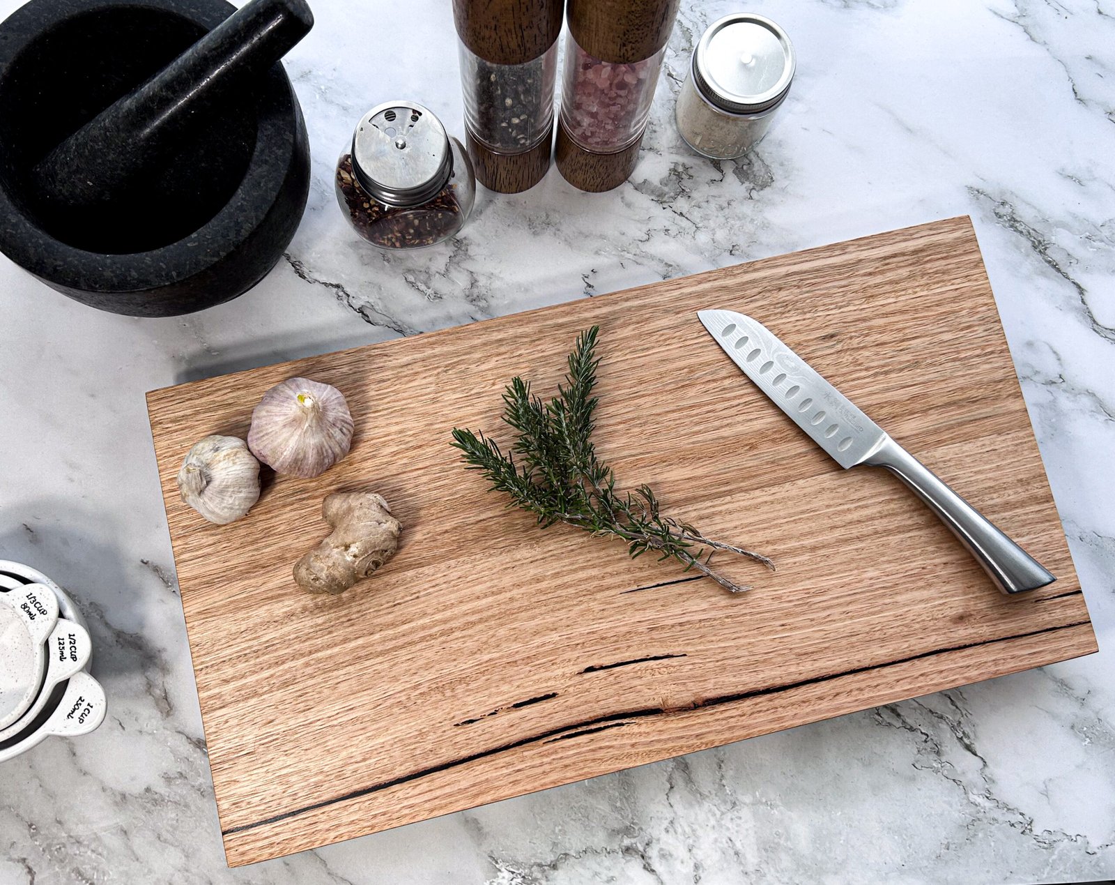 Sustainably crafted Tasmanian Oak using food-safe materials, showcasing the natural character of Australian hardwood. Subtle timber veins are hand-cleaned and filled with certified food-safe epoxy for a durable, functional cutting or serving board.